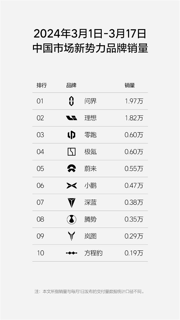和上上周相比,榜单有了新的变化,第一名被问界再次夺得,单月销量 0.86 万辆,理想汽车周销量 0.7 万辆,位居新势力品牌销量第二,截至 3 月 17 日,问界本月卖出了 1.97 万辆,而理想汽车本月销量已达 1.82 万辆,分别夺得冠亚军。