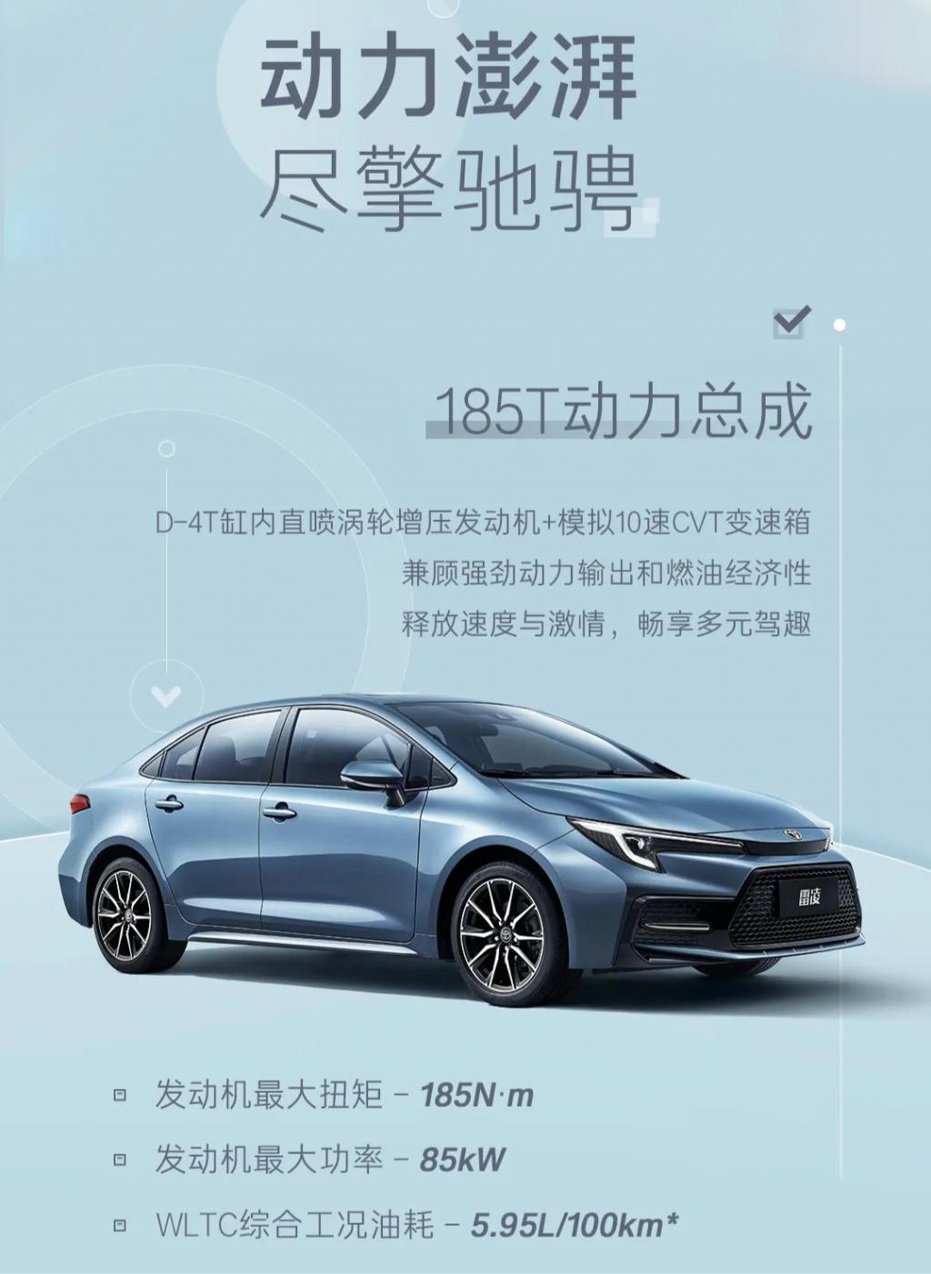 2024 款雷凌 185T 搭载 1.2T D-4T 缸内直喷涡轮增压发动机与模拟 10 速 CVT 变速箱,最大功率 85kW、最大扭矩 185N・m,WLTC 综合工况油耗 5.95L / 100km(IT 之家注:与旧款车型保持一致)。