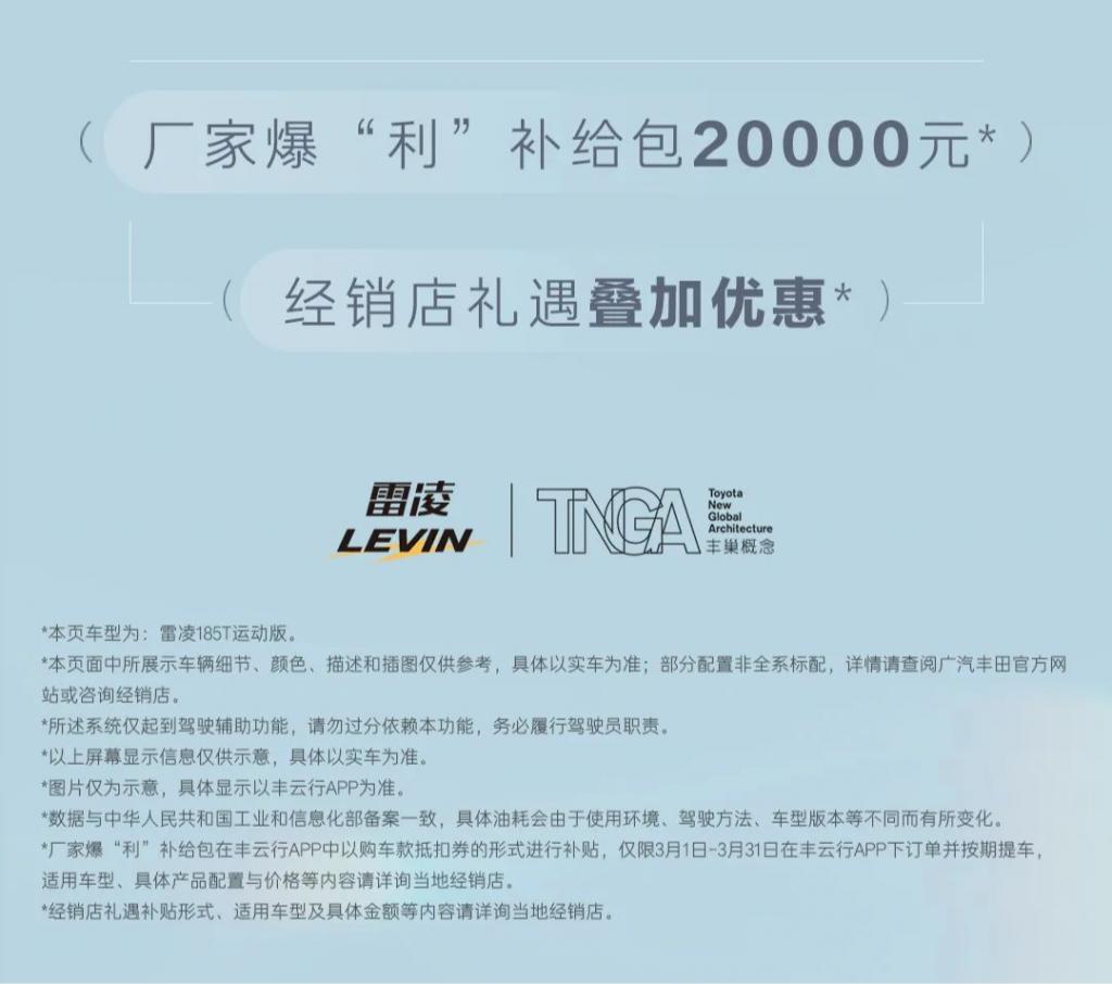 广汽丰田为 2024 款雷凌 185T 车型提供厂家爆 " 利 " 补给包 20000 元,另享叠加经销商优惠。