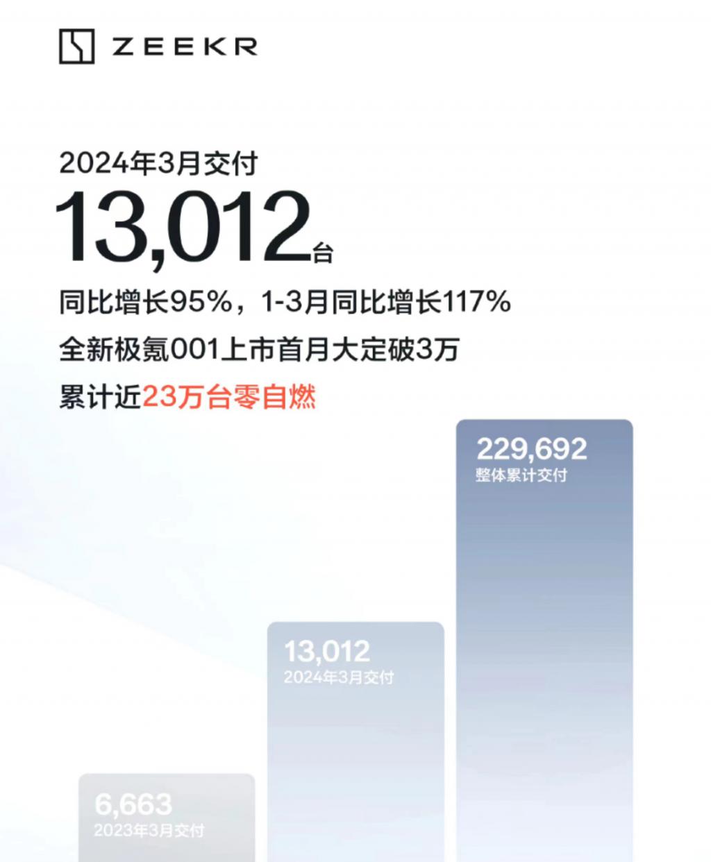 极氪 3 月交付 13012 辆,同比增长 95%,环比增长 73%;1-3 月,共交付 33059 辆,同比增长 117%。