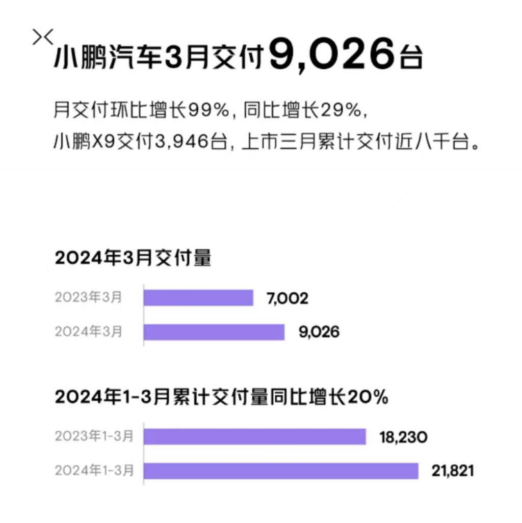 小鹏汽车 3 月交付新车 9026 辆,环比增长 99%,同比增长 29%。今年一季度,小鹏汽车累计交付新车 2.18 万辆,同比增长 20%。