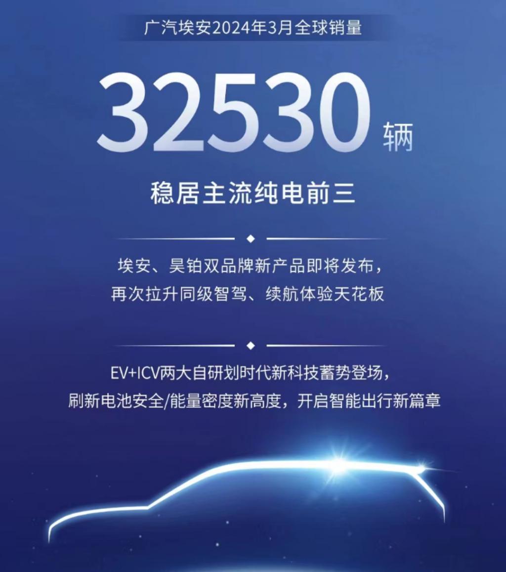 广汽埃安 3 月交付新车 32530 辆,环比增长 95.1%。埃安表示,埃安、吴铂双品牌新产品即将发布。1-3 月,埃安累计销量已达 74153 辆。