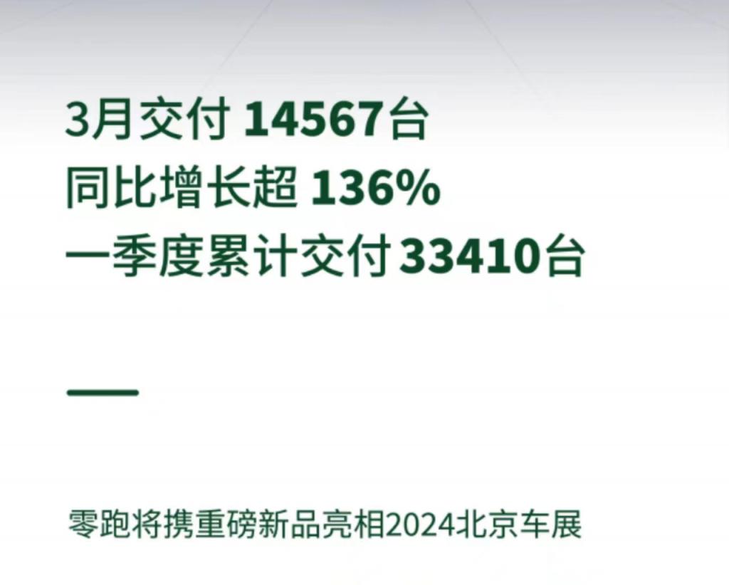 3 月,零跑汽车交付达 14567 台,实现同比增长超 136%;一季度累计交付达 33410 台。