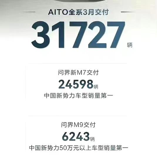 问界登顶第一变为常态。3 月,AITO 问界 3 月全系交付 31727 辆,拿下 3 月新势力品牌销量第一,再次蝉联月销量冠军。