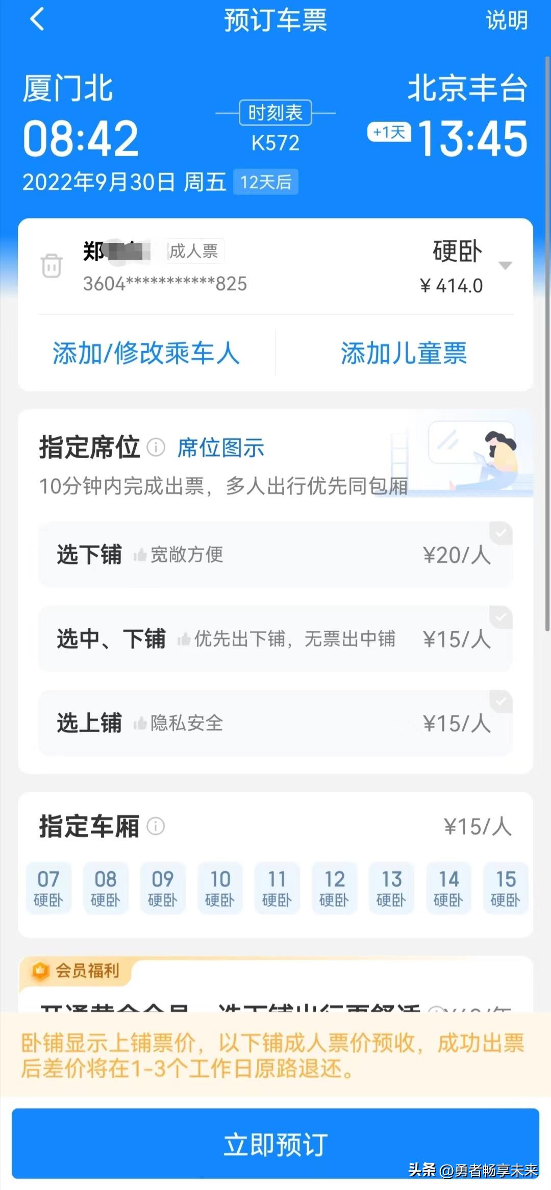 如果对所乘车次要席位选择的话,还要再次收费,以厦门到北京K572次为例,上铺收15元/人,中铺收20元/人、下铺收30元/人;如果不想花这个费用,可以机选席位,这样就不会被收费。