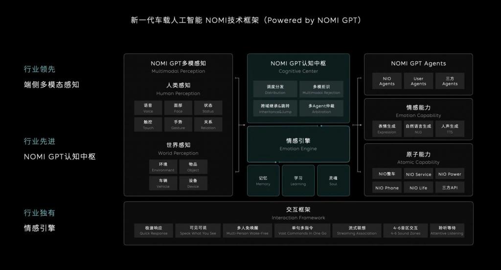 本次更新的重点,是基于全新技术架构为 NOMI 量身打造的 NOMI GPT 端云多模态大模型,它包含自研多模态感知、自研认知中枢、情感引擎、多专家 Agent,实现了蔚来产品、服务、社区的全域贯通,将提供更高效的 AI 服务。