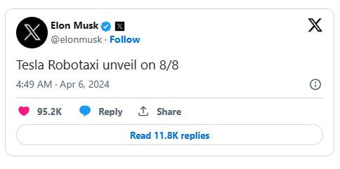 快科技 4 月 14 日消息,日前,马斯克宣布了今年 8 月推出的 RoboTaxi 自动驾驶出租车项目。