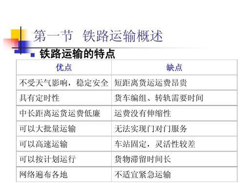 铁路运输是一种被广泛采用的运输方式,其具有一系列的优缺点,同时也有着其适用范围。本文将详细阐述铁路运输的优缺点及适用范围。