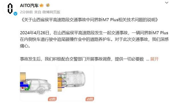 2024 年 4 月 26 日,在山西省侯平高速路段发生一起交通事故,一辆问界新 M7 Plus 在内侧快车道行驶中追尾碰撞作业中的道路养护车。对于此次交通事故,我们深感痛心。
