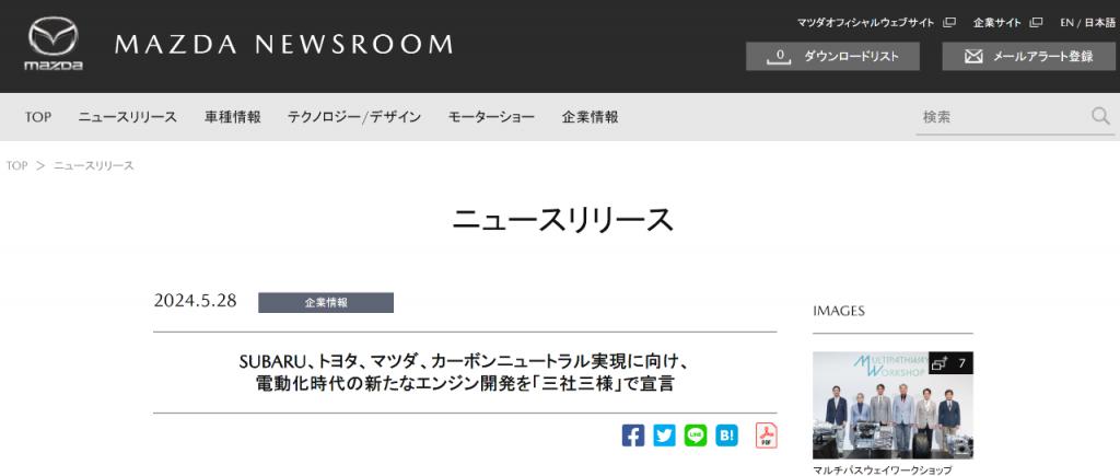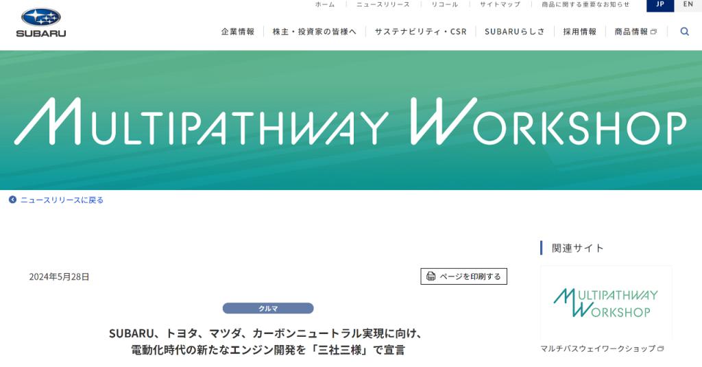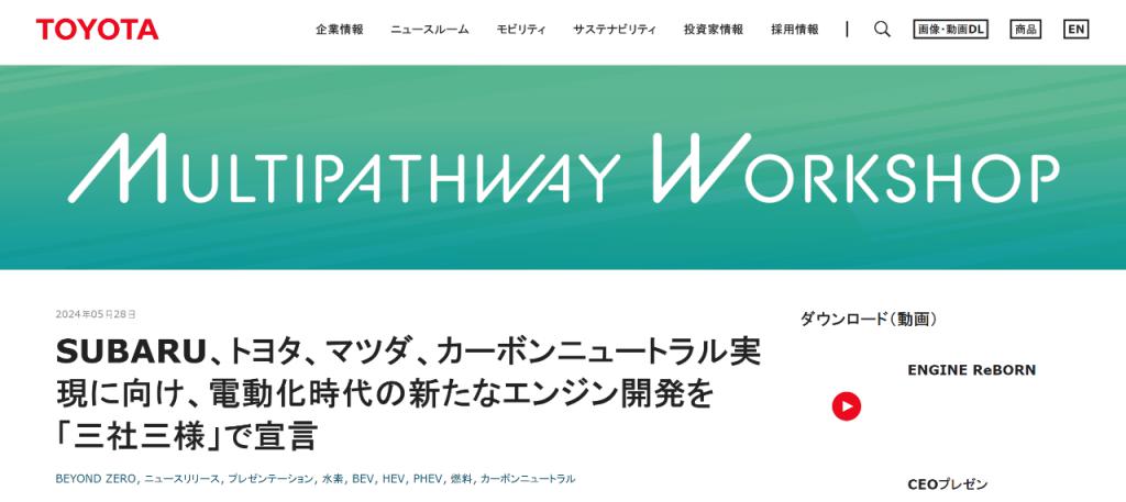 5 月 28 日,日本汽车制造商丰田汽车、马自达汽车和斯巴鲁汽车三家车企举办 " 多路径技术说明会(Multipathway Workshop)",宣布将联手共同研发下一代发动机。