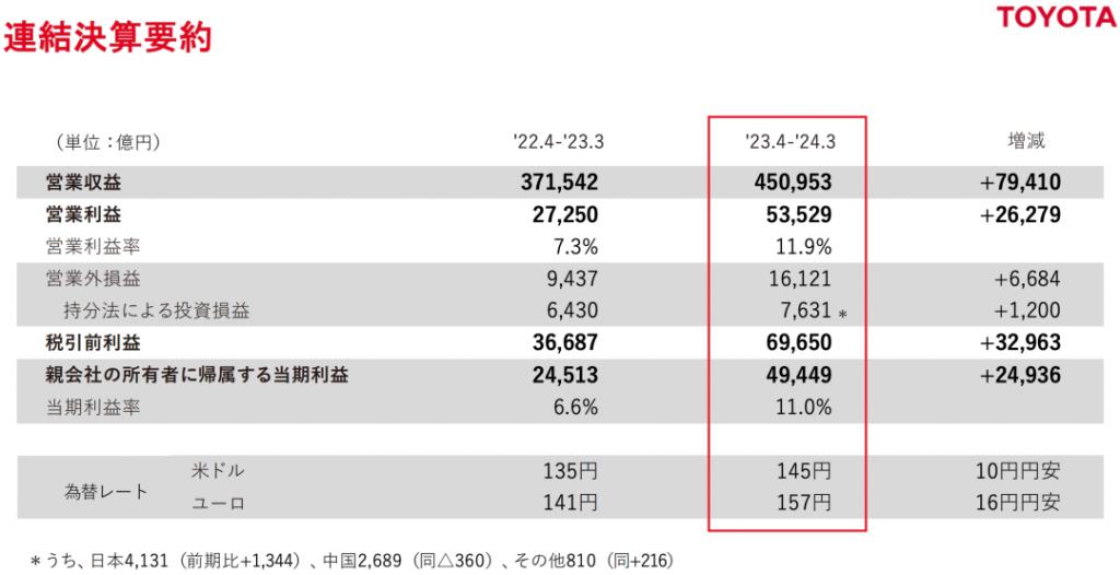 不可否认的是,在燃油车时代,无论是全球市场还是中国市场,丰田汽车无疑都是大赢家之一。5 月 8 日,丰田汽车公布 2023 财年(即 2024 年 4 月至 2024 年 3 月)财报,财务显示,2023 财年丰田汽车营业利润为 5.35 万亿日元(约为人民币 2486 亿元),同比增长 96.4%,创历史新高,成为日本首家营业利润超过 5 万亿日元的上市公司。丰田汽车表示,营业利润增长主要得益于以混合动力车型为中心的电气化车型销量的增加。数据显示,2023 财年丰田全球销量为 1109 万辆,同比增长 5%,其中丰田汽车累计销量为 944.3 万辆,同比增长 7%;丰田与雷克萨斯电气化车型(含 HEV、PHEV、BEV、FECV)累计销量 385.5 万辆,同比增长 35.3%,销量占比从 2022 财年的 29.6% 提升至 37.4%。