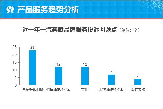 从服务投诉问题点来看," 系统升级问题 " 成为车主对于一汽奔腾品牌抱怨相对较多的服务问题。通过进一步分析可知,这类服务问题来自于奔腾 B70 车型。