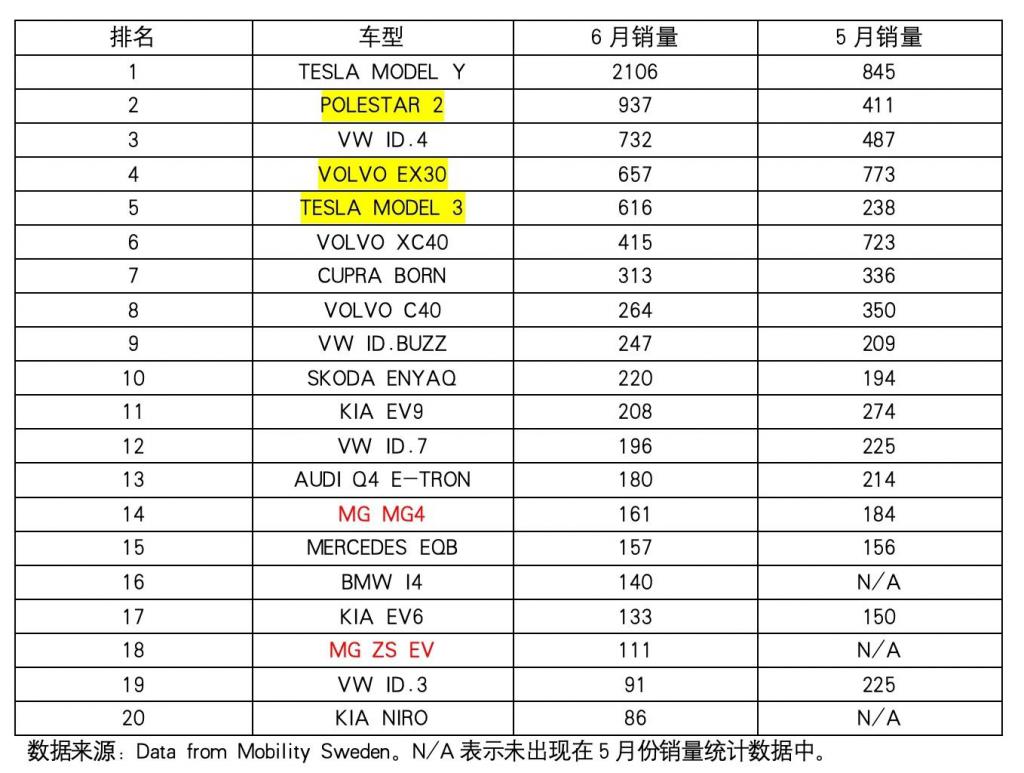 6 月份,特斯拉 Model Y 以 2106 辆注册量成为瑞典最畅销的电动车。紧随其后的是 Polestar 2,以 937 辆的成绩位居第二。大众 ID.4 可谓是以黑马的姿态,力压沃尔沃系的电动车,排名第三。沃尔沃 EX30 虽然只名列第四,但是其终端交付也达到了 657 辆,和过往月均 700 辆基本保持一致。