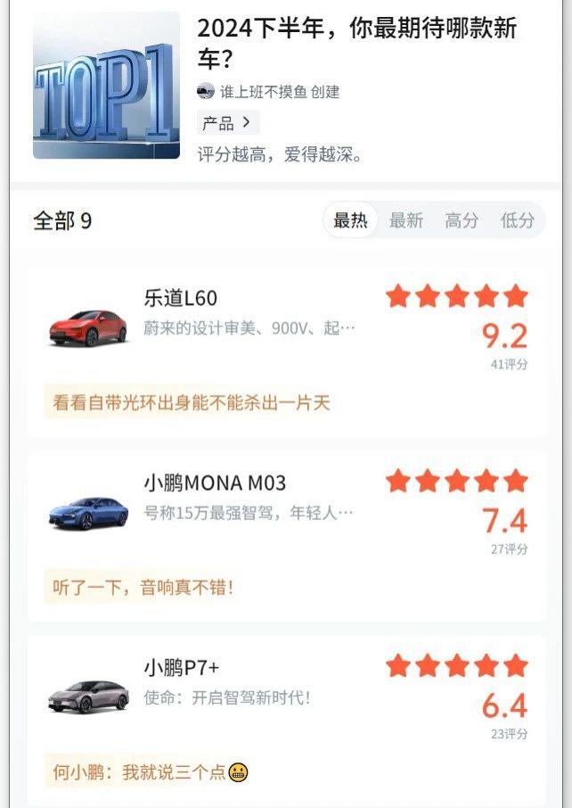 我们在来电小组小程序上,发起了「下半年热门新车你最期待谁」的评分集,有一款新车的用户期待值相当亮眼:乐道 L60。
