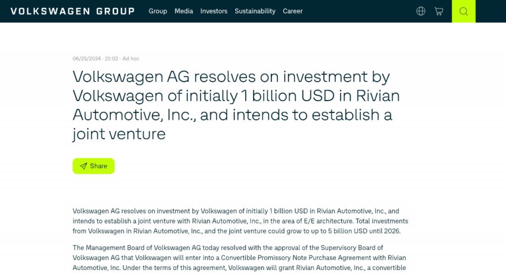 除了与小鹏合作在华推出 CEA 架构外,大众也在全球其他市场进行电子电气架构等智能化技术适配。今年 6 月,大众汽车在美国和 Rivian 共同宣布,双方合作旨在专注于软件、电子控制单元和相关网络架构的设计和开发,大众汽车计划于 2026 年开始使用 Rivian 的区域 ECU 架构等技术。公开资料显示,Rivian 创立于 2009 年,为美国电动汽车制造商,一度被称为 " 特斯拉杀手 "。