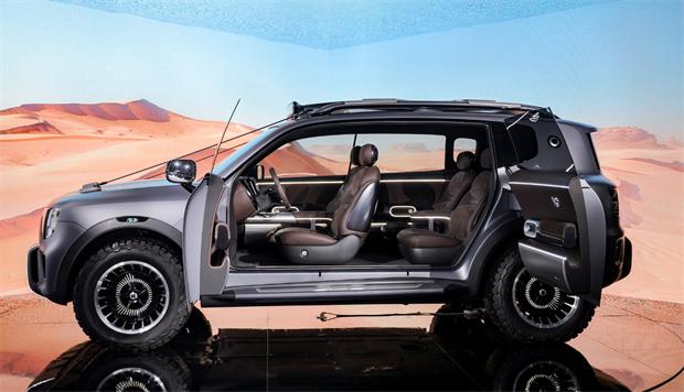 七月盛夏,上海南京路步行街出现了一个快闪展台,主打科技感的舞台,搭配了一辆户外风的汽车,对开门、无 B 柱、磨砂灰黑色,防撞踏板、隐藏绞盘、车顶射灯,产品经理指着行李架告诉我,设计灵感源自瑞士军刀。