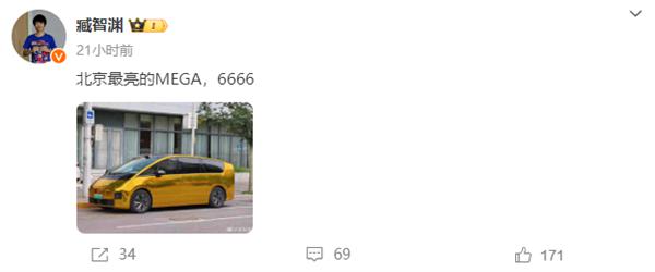 从照片看,这台 MEGA 悬挂的是京 A 的牌照,整车金碧辉煌,除了大灯、外后视镜,其他地方均覆盖有金色的贴膜,甚至包括隐藏式门把手和翼子板的后摄像头外壳等细节之处。