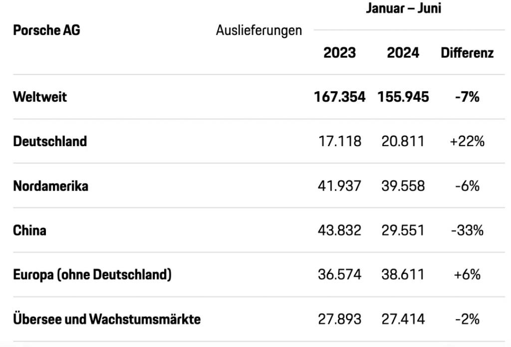 然而,从销量上来看,保时捷在 2024 年上半年的全球销量为 155945 辆,与去年同期相比下降了 7%。其中,中国市场总交付量为 29551 辆,同比下滑了 33%,是唯一一个跌幅超过两位数的市场。这也使得保时捷失去了全球最大的单一市场位置。