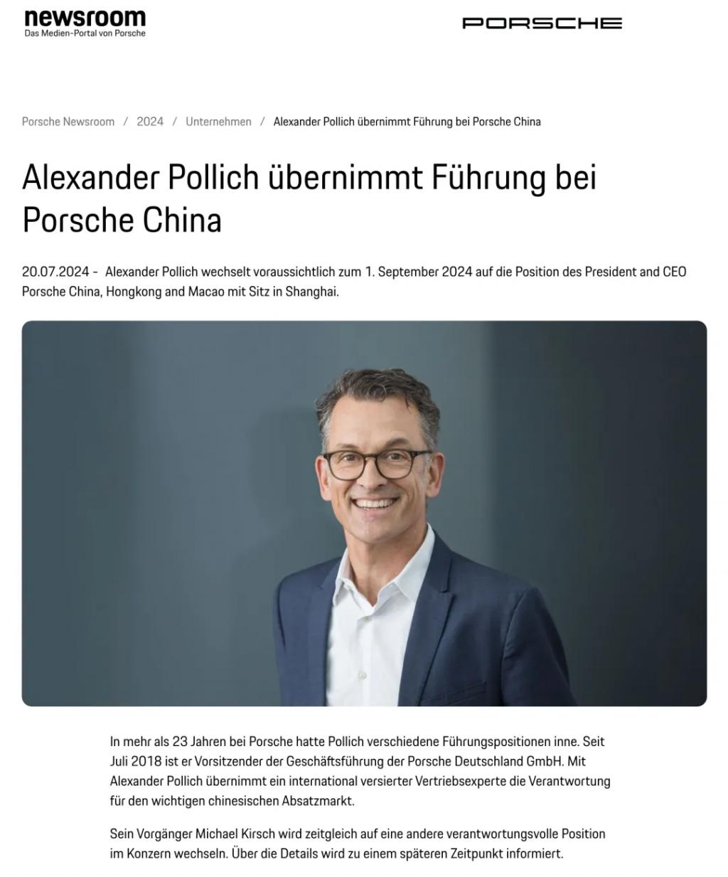 在今年的 7 月 20 日,保时捷汽车公司发布了最新的人事调整公告。根据公告,Alexander Pollich 将在今年的 9 月 1 日正式接替 Michael Kirsch,成为保时捷在中国大陆、香港、澳门地区的 CEO。而 Michael Kirsch 则将返回德国,承担新的重要职责,具体将会在稍后公布。
