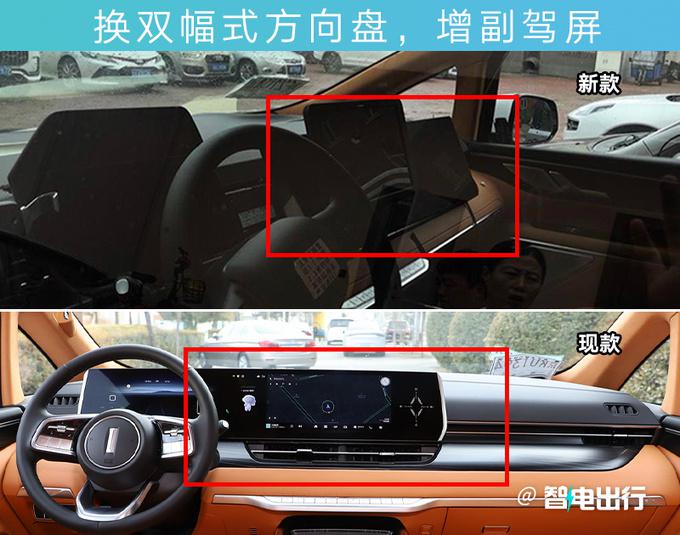从谍照来看,高山智驾版将配备双幅式方向盘,参考蓝山智驾版,前排双联屏预计为 15.6 英寸,高配车型还将配备后排娱乐屏,中控区域保留空调实体按键。
