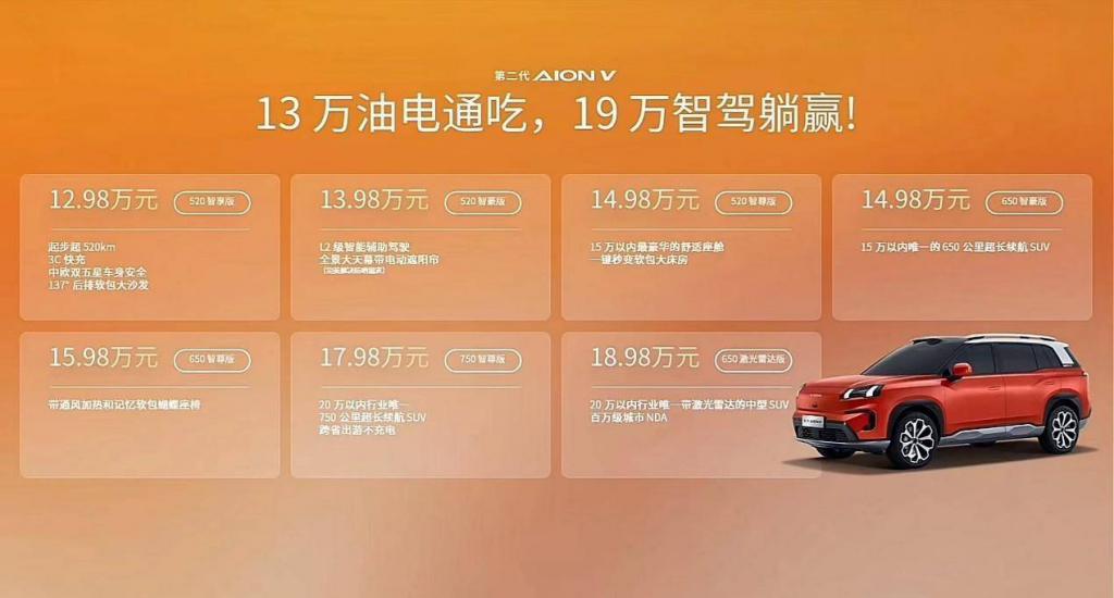 7 月 23 日,埃安首款全球战略车型——第二代 AION V 埃安霸王龙全球同步上市。新车共推出 520km、650km、750km 三种续航 7 个配置版本,售价区间为 12.98 万 -18.98 万元。