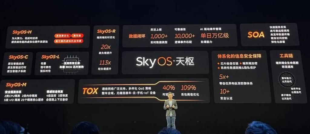SkyOS · 天枢对于智能汽车的作用,就像安卓之于智能手机,Windows 之于电脑,可以理解为智能汽车的操作系统,它从底层上打通了智能硬件、计算平台、通信与能源系统,实现对车联、车控、智能驾驶、数字座舱、手机应用等全域应用的统一管理与协调,在 AI 时代构建真正的整车全域智能。