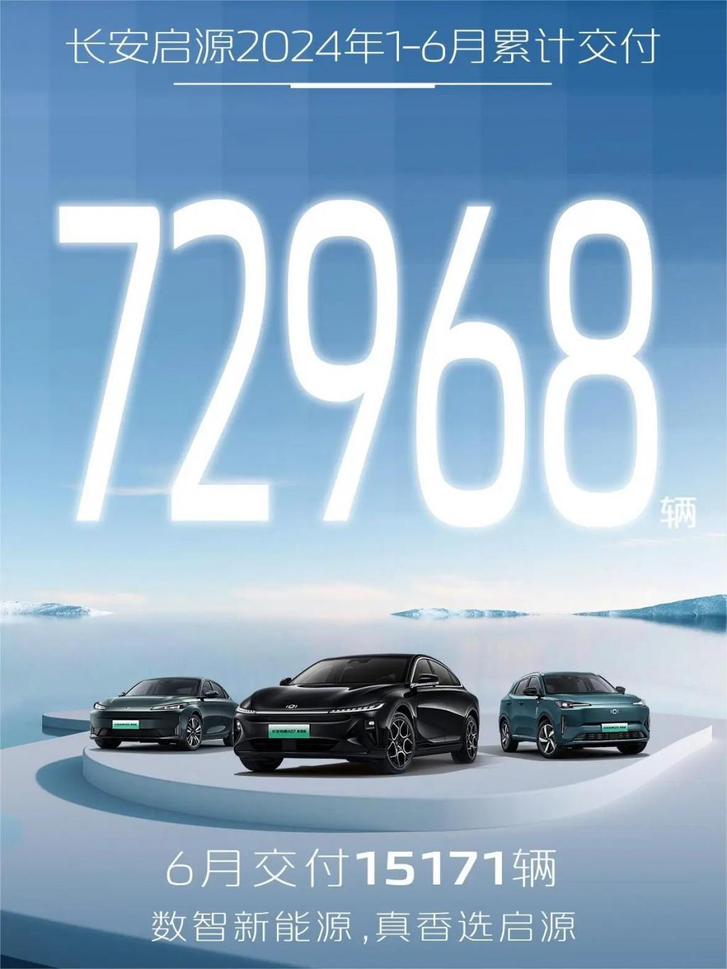 长安启源上半年全系车型累计交付量达 72968 辆,6 月交付 15171 辆,环比增长 12%,就从这刚出道就能有这样的架势来看,很是让人憧憬。