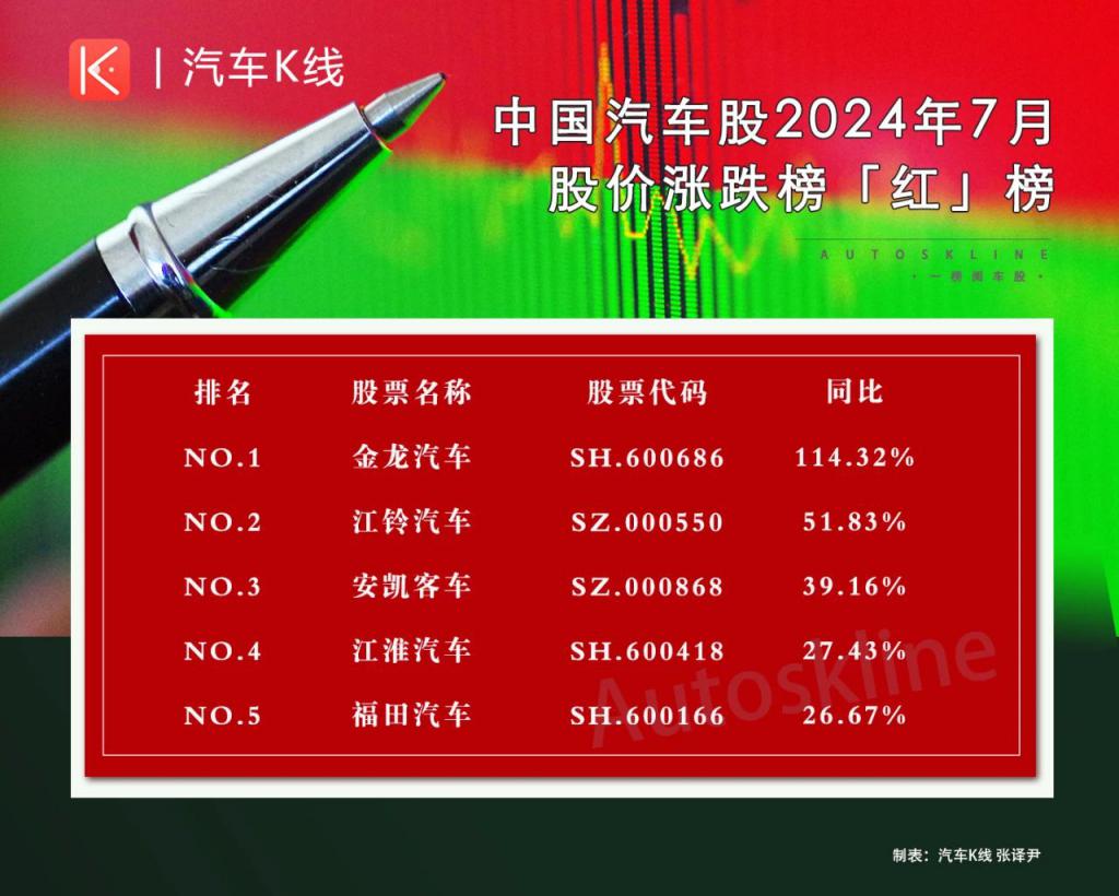 但资本市场的这场狂欢,并没有把金龙汽车的公告看在眼里,7 月分别上涨 51.83%、39.16%,位居总榜第 2、3 位的江铃汽车、安凯客车同样受上述概念带动强势拉出多个涨停。