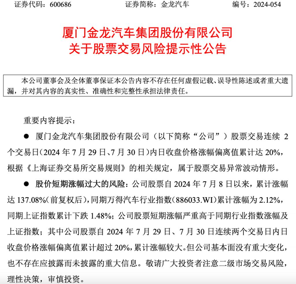 在 7 月 30 日发布的公告中,金龙汽车对比了 7 月 8 日以来的一组数据:期间金龙汽车股价上涨 137.08%,但同期万得汽车行业指数累计涨幅仅为 2.12%、上证指数下跌 1.48%," 公司股票短期涨幅严重高于同期行业指数涨幅及上证指数 "。