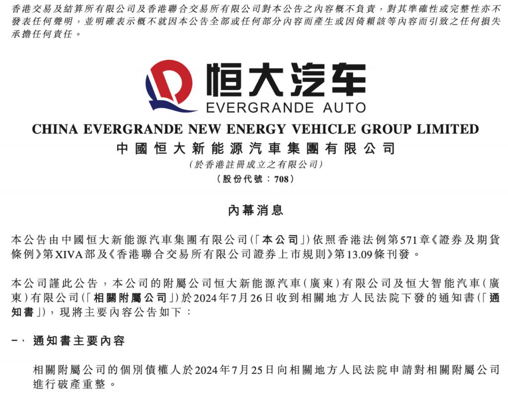 7 月 28 日晚,恒大汽车发布公告称,其附属公司恒大新能源汽车(广东)有限公司及恒大智能汽车(广东)有限公司的个别债权人,已于 7 月 25 日向相关地方人民法院申请对上述相关附属公司进行破产重整。