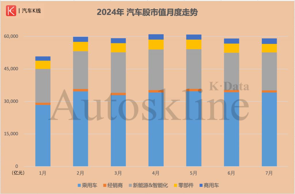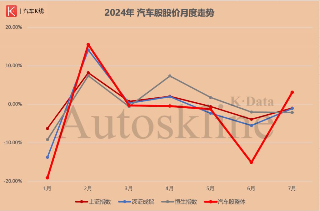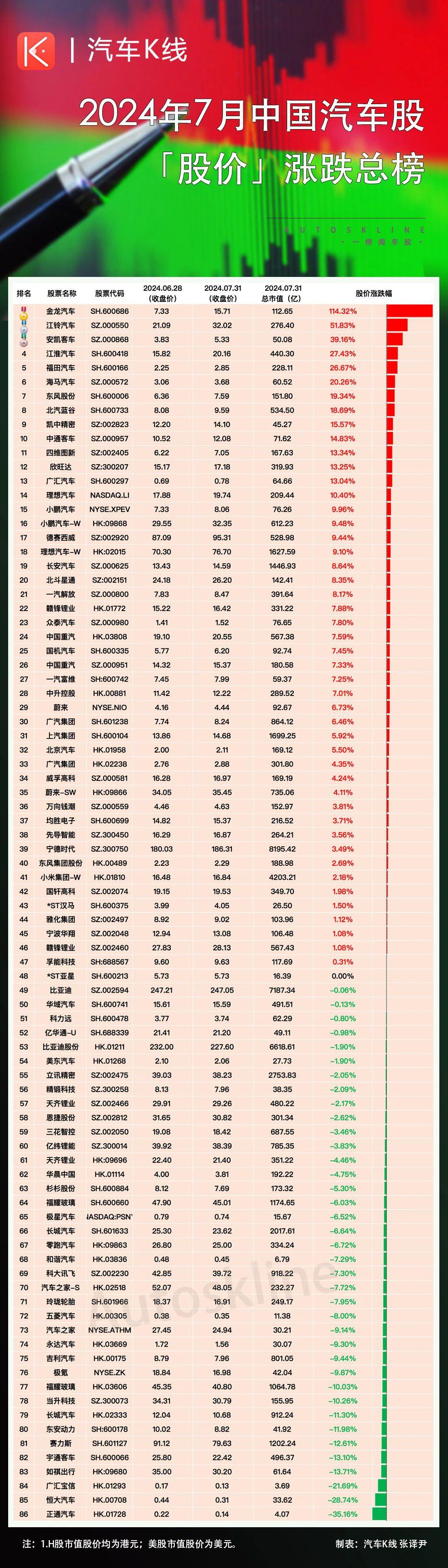 据《汽车 K 线》统计,7 月 86 只中国汽车股,共有 47 只实现上涨,占比达到 54.65%,与仅 23 只上涨(占比仅 27.38%)、整体下跌 15.09% 的 6 月相比止跌回升,整体平均股价上涨 3.14%。