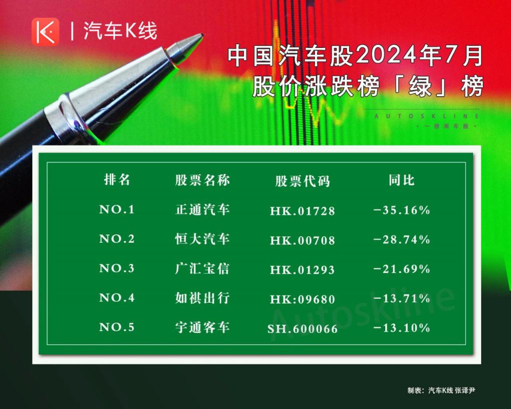 拥有大量宝马经销商网络的正通汽车,自宝马退出价格战的消息传出后股价连续 5 个交易日下跌,特别是 7 月 16 日,正通汽车股价低开并大幅下跌 12.82%。最终在整个 7 月,正通汽车股价下跌 35.16%,垫底汽车股。