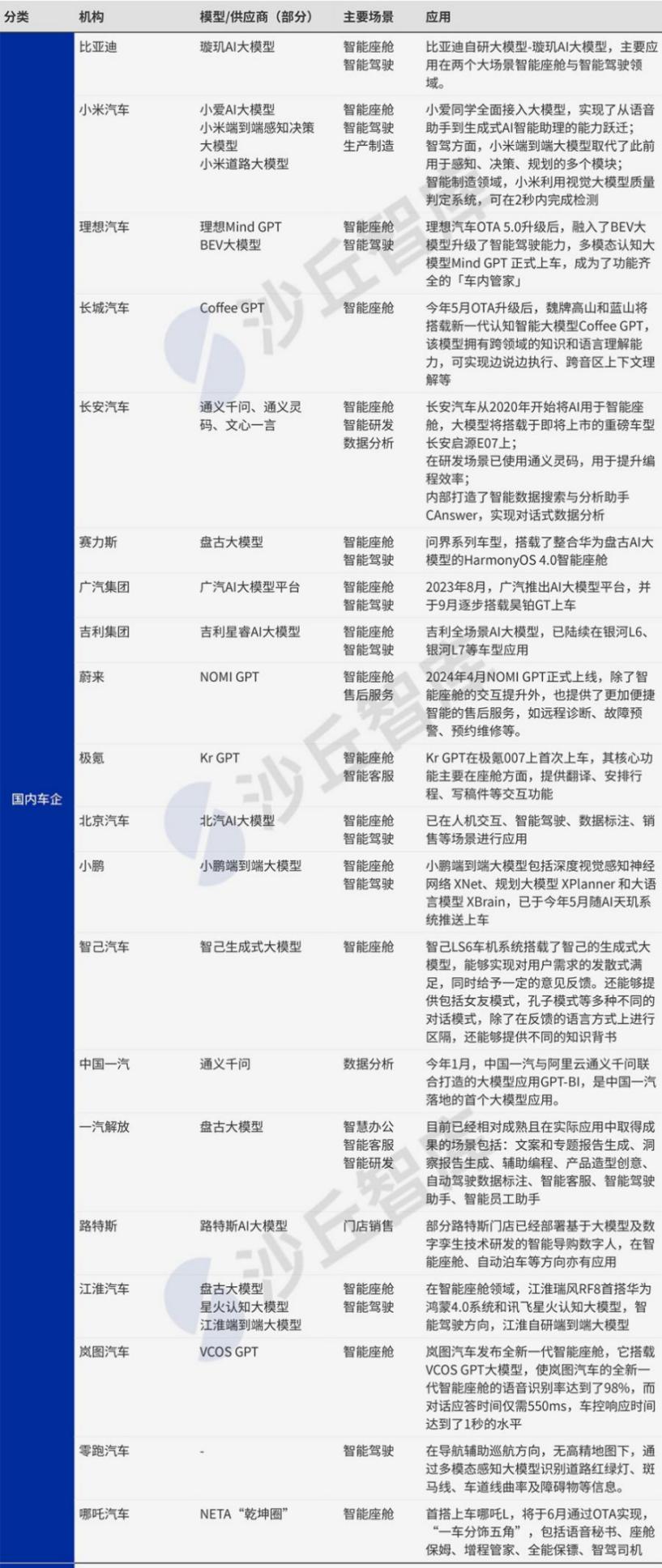 但相较于 " 蔚小理 " 等新势力集中火力猛攻智能驾驶,互联网巨头、科技独角兽则在探索 AI 大模型在车端场景的更多应用,不仅在智能驾驶方面,还在智能座舱、生产研发、营销推广等方面。