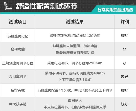 在主驾驶座椅测试中,评测车的主驾驶座椅最前端和最末端之间的距离为 290mm,在测试过的同级别车型中处于上游水平,可满足大部分驾驶者的使用需求。