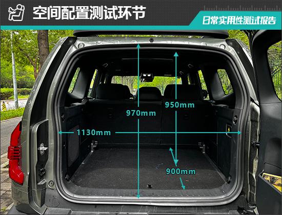 对于评测车后备厢的基础数值,我们也进行了实测,开口长度为 970mm;开口宽度为 1130mm;后备厢进深为 900mm;后备厢地台与顶部的垂直高度为 950mm。