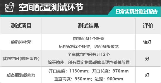 经过实测,评测车全车共计 12 个储物空间(不含杯架),上述固定物品除墨镜外,均能摆放到储物格内,并且位置设计合理,拿取物品十分方便。