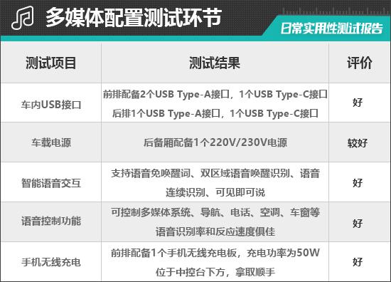 评测车配备 3 个 USB Type-A 接口和 2 个 USB Type-C 接口。其中,前排 3 个接口分别位于前排中央通道两侧,后排 2 个接口位于两侧门板处,分别为 1 个 USB Type-C 接口和 1 个 USB Type-A 接口,布局合理且兼容性不错。此外,后备厢还提供 1 个 220V/230V 电源接口。
