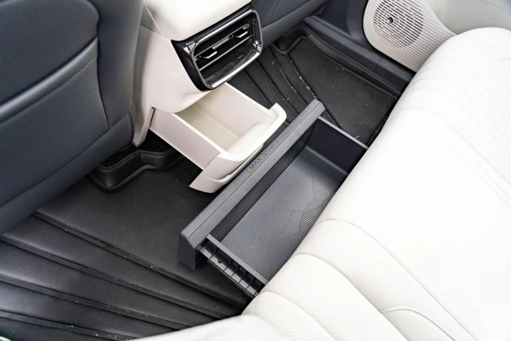 除常规的后排车门侧面储物空间外,银河 E5 还在后排布置了组合储物盒,由一个容积 3.2L 的抽拉式抽屉和专属设计的手机储物格组成;在后排座椅下方增加了大容积储物盒,14L 的超大空间可容纳毛毯、衣服、儿童零食等各种物品。