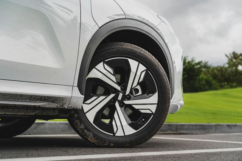 19 英寸轮圈采用低风阻设计,其配备的轮胎在这个级别非常有诚意,来自固特异的御乘 SUV II 代,规格为 235/50 R19,终端价格在 1,000 元 / 条,主打静音舒适与舒适性。