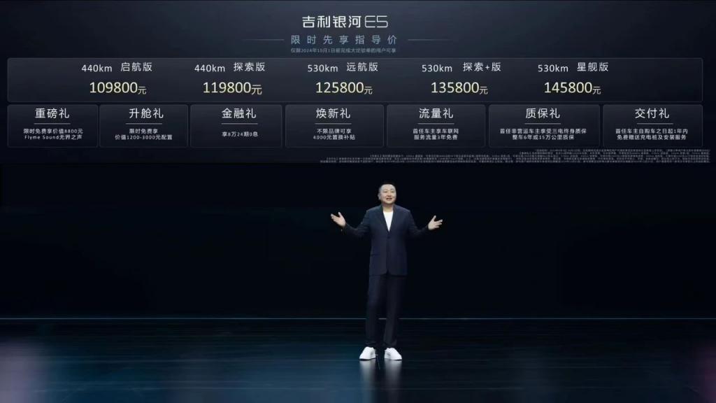 目前,吉利银河 E5 正式宣布上市,新车共推出 5 款车型,售价区间 11.28-14.88 万元。在发布会上官方表示,在 2024 年 10 月 1 日前完成大定锁单的用户,将额外享受 3,000 元的先享限时补贴,其 " 限时先享指导价 " 为 10.98-14.58 万元。