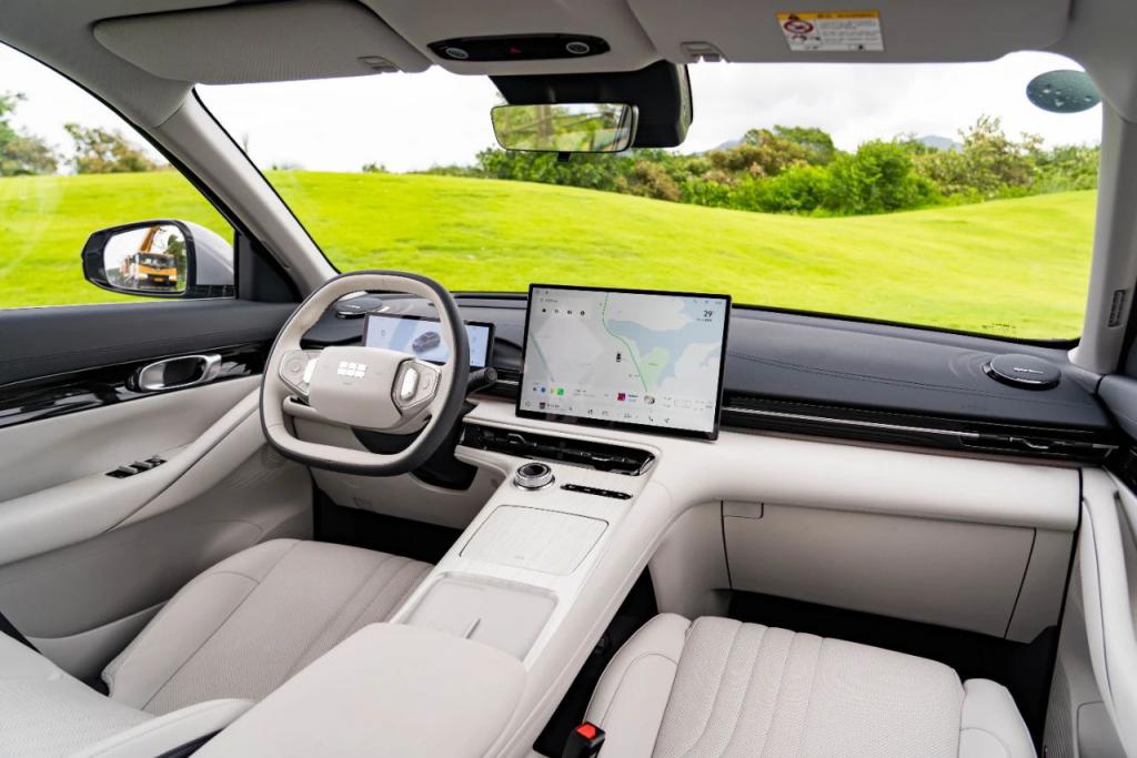 10.2 英寸全液晶仪表前方是 13.8 英寸的 HUD 抬头显示,可显示车速、车道、导航、交通标识与 L2 驾驶辅助信息。15.4 英寸 2.5K 中控屏采用 LTPS LCD 与 Incell 技术的液晶面板,分辨率为 2560 × 1600,PPI 可达 197,峰值亮度 800nit,内置 7nm 芯片 " 龍鹰一号 ",整体性能媲美骁龙 8155 的水平,运行内存达到 16G。