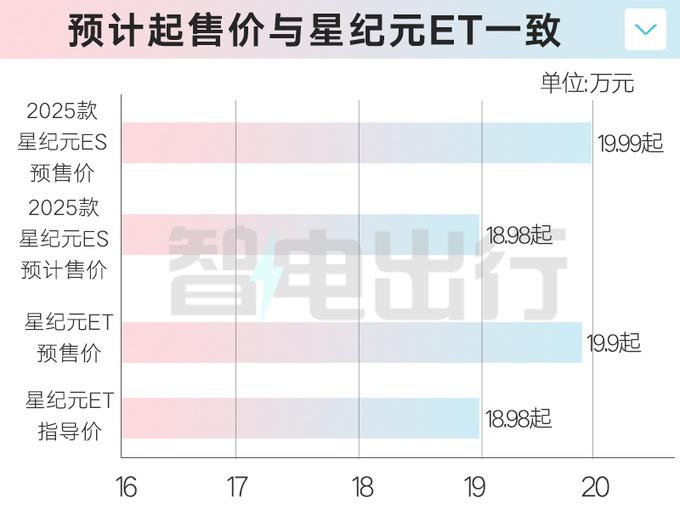 2025 款星纪元 ES 将于 8 月 21 日上市,预售 19.99 万 -30.99 万元(包含限量 1000 台的国际版)。此前上市的星纪元 ET,预售价与 2025 款星纪元 ES 接近,正式售价比预售价便宜 0.92 万,预计 2025 款星纪元 ES 指导价也将比预售价便宜,可能同样卖 18.98 万元。