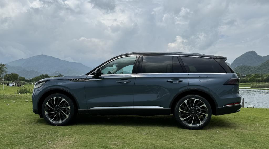 来到侧面,全新林肯飞行家 5080mm 的车长再配上这种前高后低的侧面线条,就和它的名字一样,呈现出一种要起飞的姿态。