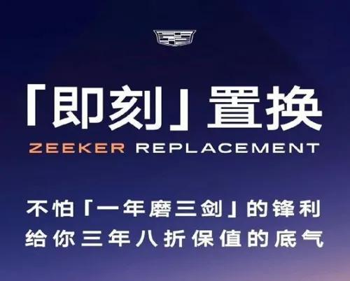 " 半年迭代两次 " 的极氪可谓是流量拉满,谁都想来蹭躺 " 顺风车 "。这不,极氪发布会结束不久后,一旁看戏的凯迪拉克就 cue 上了。昨日晚间,凯迪拉克官微便发了张耐人寻味的海报," 不怕 " 一年磨三剑 " 的锋利,给你三年八折保值的底气 ",而且图中即刻的英文转译还特意用上了 "ZEEKER" 字样。
