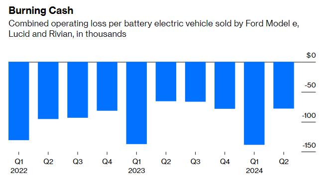 实际上,不仅仅是特斯拉,这种情况已经成为困扰美国电动汽车行业的一个普遍且令人不安的趋势。从 2022 年开始,福特,Lucid,Rivian 卖出去的每辆电车都是亏损的。