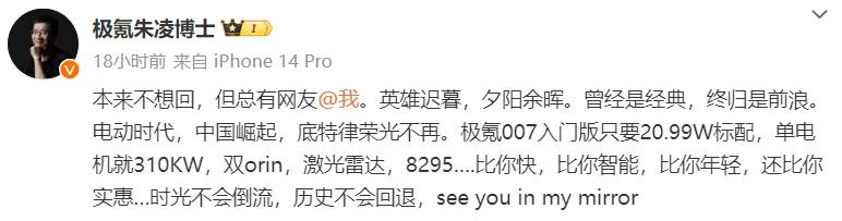 被贴脸开大的极氪,自然十分气愤。其中极氪副总裁朱凌便回怼道," 极氪 007 入门版只要 20.99W 标配,单电机就 310KW,双 orin,激光雷达,8295... 比你快,比你智能,比你年轻,还比你实惠,时光不会倒流,历史也不会回退。"