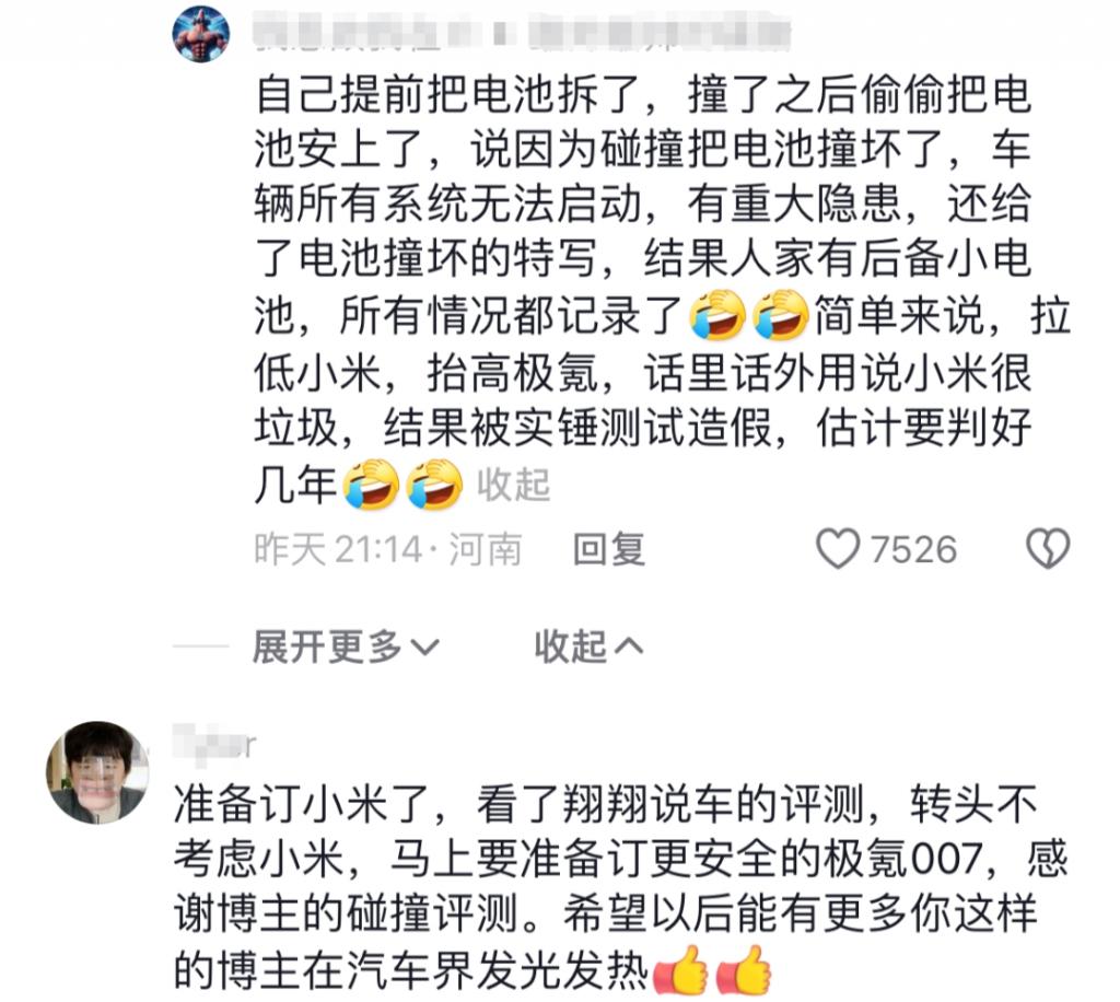 在博主的道歉视频中,眼睛是微红的,声音是哽咽的,紧张感是肉眼可见的。但网友们认为博主是碰撞测试前拆掉了电池,事后再安装上,但没有料到不仅视频剪辑有漏洞,还有备用电池记录车辆情况。很多网友也是看热闹不嫌事大,在评论区 " 拱火 ",颇有一种看热闹不嫌事大,誓要把博主往绝路上逼的架势。