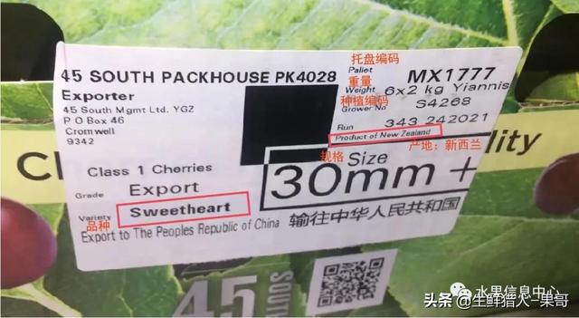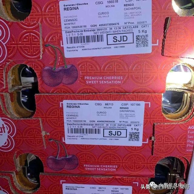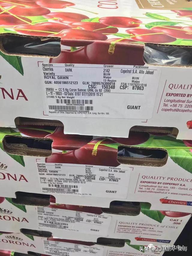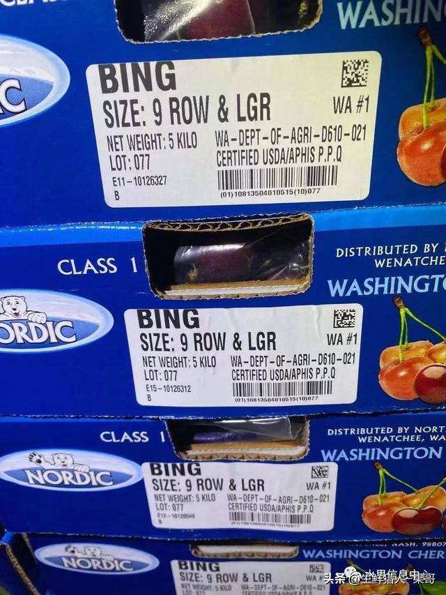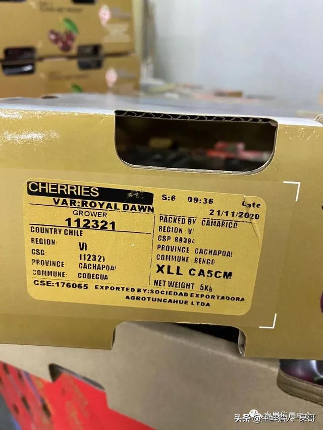 一般来说,箱头信息主要包括:1.品种 2.大小规格 3.颜色 4.重量 5.日期,这几个要素比较重要。不同国家不同品牌的外箱标准都有差异。品种、规格大小➕黑➕深(也是决定车厘子的价格因素之一)