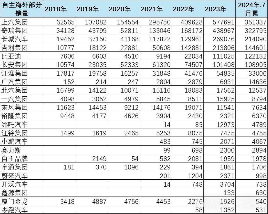 事实上,汽车出海仍是燃油车主导,也越来越显露出,这是头部企业们的游戏。2018 年时,奇瑞的海外销量是江淮集团的 2 倍左右,到 2024 年差距已经接近 10 倍。
