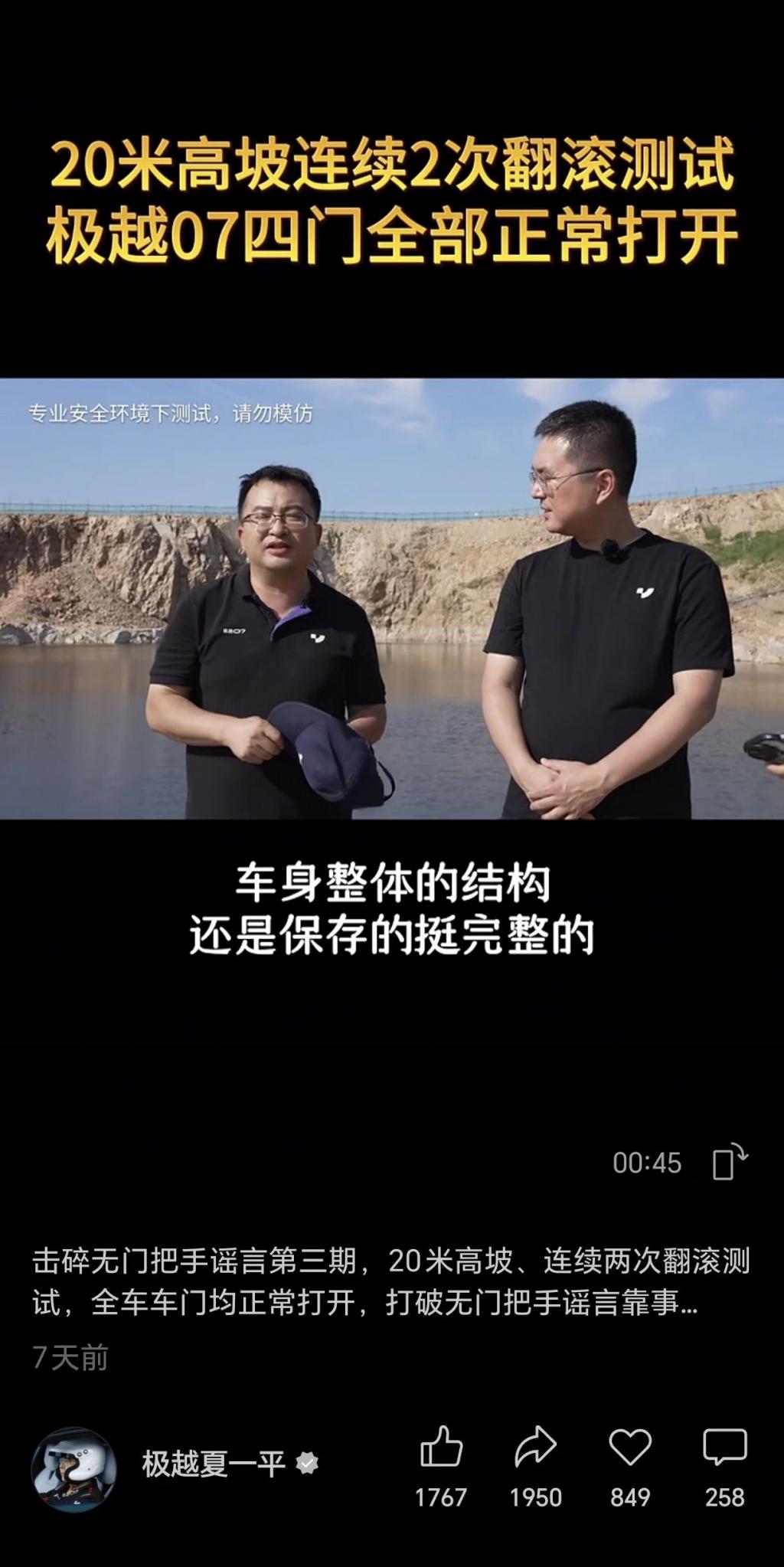 9 月 4 日,夏一平在徐州将一台极越 07 从 30 米高的坡上直播连续推下来两次,翻了 15 个滚后,四个无把手智能电动门均能正常打开。